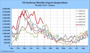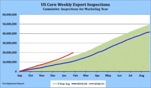 Soybeans traded lower but off session lows. Talk of good rains in Argentina and the end of the Argentina truck strike offered resistance. Favorable Brazil weather and some talk USDA could increase Brazil soybean crop in their Feb report also weighed on prices. There are also estimates that Brazil soybean harvest could start in 2-3 weeks. Weekly US soybean exports were near 66 mil bu vs 77 last week and 51 last year. Season to date exports are near 1,736 mil b versus 979 last year. USDA goal is 2,230 vs 1,682 ly. US soybean export commit is near 2,125 mil bu versus 1,161 last year. USDA estimates US carryout near 140 which some feel is minimum pipeline. Some could see China needing to switch 50-100 mil bu soybean from Brazil to US due to Brazil late harvest. This could drop final US carryout below 100 mil bu.