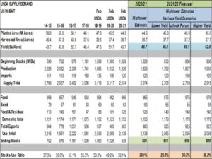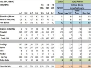 Wheat futures ended higher. WK had an inside day and tested Fridays high near 6.72. WN trade above Friday high. Both continued to trend higher from Dec lows. KWK also tested Fridays high near 6.51. KWN made a new weekly high near 6.55. Much of new buying was due to expectations that USDA weekly US south plains crop ratings will drop due to last week’s record cold temps. Uncertainty over Russia new crop export policy and talk of declining EU wheat exports also offers support. USDA est US 2021 wheat acres near 45.0 vs 44.3 last year and yield near 49.1 vs 49.7 last year. USDA est of US 2021/22 wheat carryout is near 698 mil bu vs 836 this year. This should support wheat prices. Weekly US wheat exports were near 11.9 mil bu vs 16.0 last year. Season to date exports are near 652.5 vs 667.1 ly. USDA goal is 985 vs 965 ly.