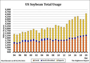 Soybean traded higher led by soyoil. Increase China demand for palmoil, lower sunoil and canola oil World supplies and higher energy prices pushed BOK over 50 cents. Powell’s comments on US lifestyle will be back to normal by yearend and they will continue to pump $120 billion each month into US economy was welcomed news to the bulls. Brazil soybean harvest is near 35 pct. April-May Brazil soybean prices are 54 cents lower than US. There are even estimates that MG Brazil harvest could be closer to 80 pct. Some fear the soybean demand led rally could be over soon. Still, USDA Ag Forum numbers suggest US will have to have a perfect 2021 soybean crop to push prices lower. Weekly US soybean export sales are est near 200-800 mt versus 456 last week. New crop sales are est near 0-500 mt versus 168 last week.