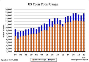 Corn futures traded higher. Managed funds added to longs on talk of higher demand for commodities. Managed funds are est to be now net long almost400,000 corn contracts. Cash suggest there may not be any March corn deliveries. Powell’s comments on US lifestyle will be back to normal by yearend and they will continue to pump $120 billion each month into US economy was welcomed news to the bulls. Brazil 2nd crop corn plantings are advancing. Some est MG plantings near 75 pct done. April-May Argentina prices are 29 cents lower than US. Some feel Argentina could rob US June-Aug corn export demand but lower 2021 Argentina corn crop could suggest US could regain export edge in Sep. China corn futures were higher. There is talk of China beginning to buy 2022fFeedgrain imports especially barley. China may be adding to feed imports due to increase piglet numbers. Weekly US ethanol production dropped 28 pct from last week and 37 pct from last year due to last week’s record cold temps. Stocks also dropped from last week and last year. Talk that Biden may not allow EPA to offer refiners waivers offered support to corn domestic demand. Weekly US corn export sale are est near 500 to 1,300 mt vs 999 last week.
