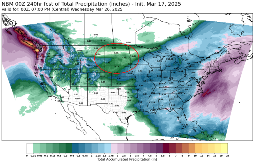 Next 10 Days of Precipitation. The area circled in red is already in a moderate-severe drought and the next 10 days of precip are not helping.