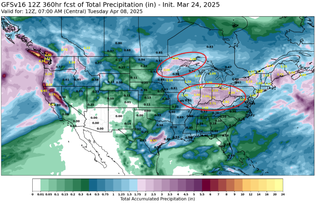 The 14 Day Rain Forecast is showing wet weather ahead for the Ohio River Valley and central Minnesota Dry concerns in OK/KS/NE/SD/ND are still creeping into conversations.
