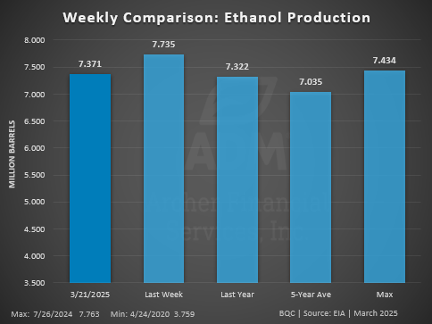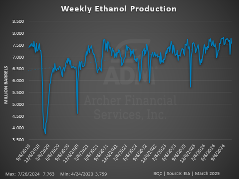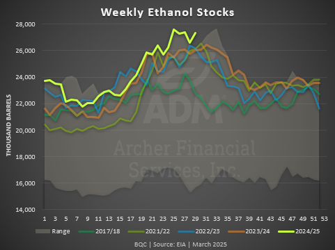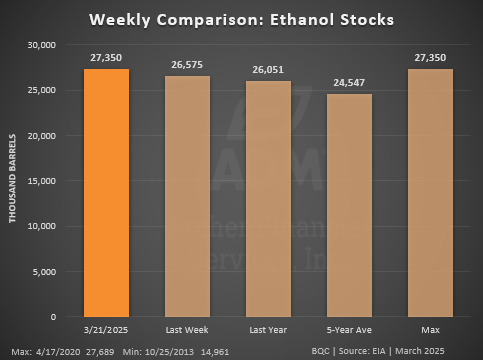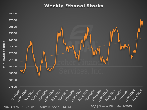 Ethanol Stocks increased above expectations despite the low production, now at 27.4 million barrels. This is the highest ethanol stocks have been for this time of year.