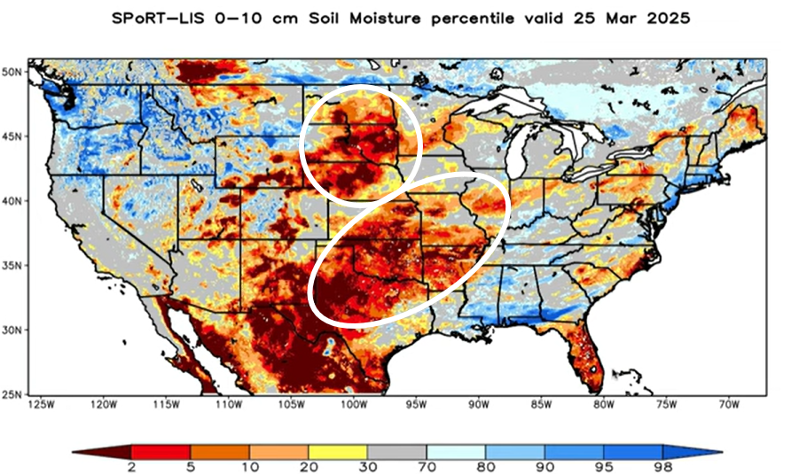The US Soil Moisture Map is lacking crucial moisture in the two circled areas below. This effects winter wheat quality, the early growing stages of the upcoming corn crop, and possibly the protein demand in the livestock market due to the lack of green grass.