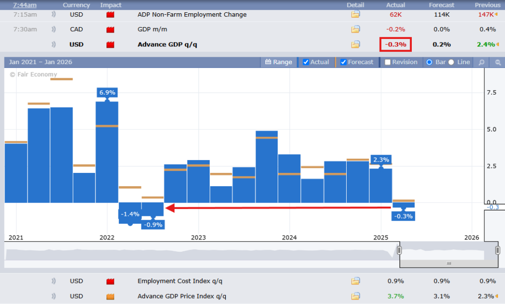 The US GDP drops -0.3% in Q1 2025. This is the first negative GDP number since July of 2022. GDP month over month was down -.2% accounting for most of the losses in March. ADP Non-farm employment change was reported -52K fewer new jobs than expected. The Advanced GDP Price Index which is a broad indicator of inflation rose to 3.7% for Q1 2025, 0.6% higher than expected.