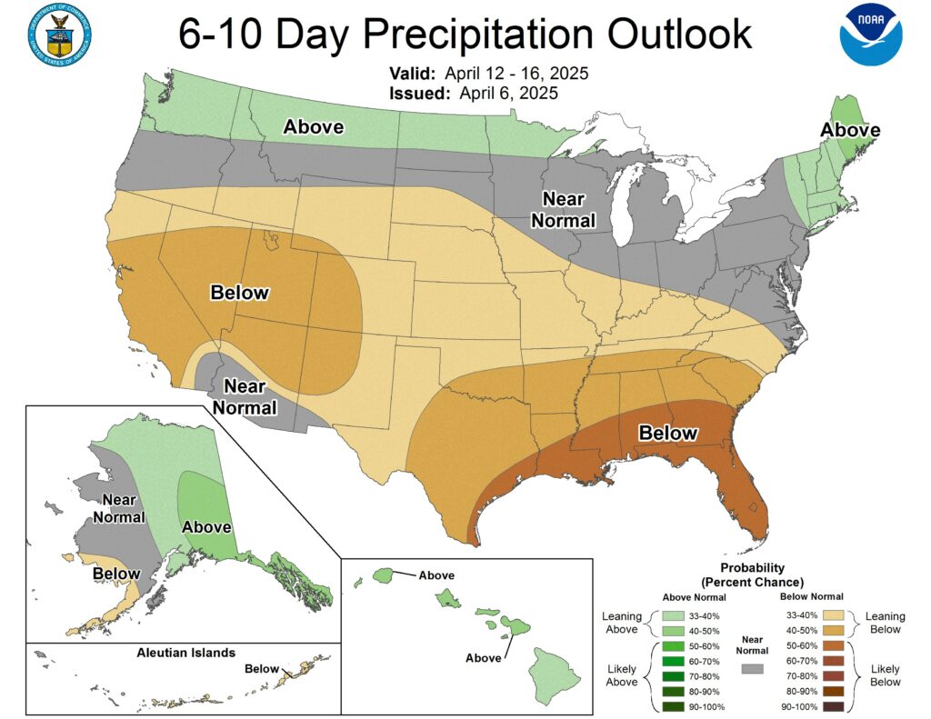 This Thursday, April 10th, the USDA will release their monthly WASDE report. The 2025/2026 new crop numbers will not be out on this week’s report but rather on the May 12th report. Expectations are a readjustment to the demand side of the balance sheet. Corn exports and ethanol demand has been higher than the pace needed to reach the current estimates. So bulls are hope to see an increase of 25-50 million bushel between those two demand outlets, but corn feed and residual may under perform expectations by -50M to over -100M bushels. We will see planting progress per state released later this afternoon. Rains in the southern regions will put many farmers in KY, southern MO, TN, AR and northern MS slightly behind pace for now. Soybeans have felt the most pain with an over 50¢ drop year to date. The mixture of increased tensions with our largest soybean trade partner, China, and the cooperative weather in South America has allowed their soybean harvest to progress on schedule. Funds and Managed Money were both friendly soybeans and soybean oil last week, but most speculators have set up camp on the sidelines until more information is reveled. Any day now there could be an announcement, foreign or domestic regarding trade policies as negotiations over tariffs continue. Wheat is leading the charge back this morning as weather in the US and pending crop conditions are giving life to the wheat complex. Today’s state-by-state crop condition report should help shed more light on the current state of the US winter wheat crop.