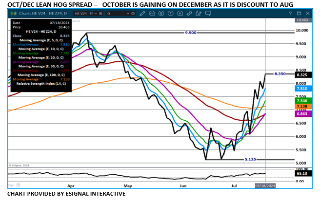 Cash cattle sales started Thursday. Both the Midwest and the southwest sold cattle mostly $2.00 lower. Fob steers in the Midwest mostly 196.00 to 197.00 dressed steers $309.00 to $310.00. The spread remains wide between regions. If the cattle on feed report is bearish, the downside for October live cattle on out into 2025 likely will see bear spreads widening with additional pressure on futures as speculative traders reverse long live cattle and short lean hog spreads.