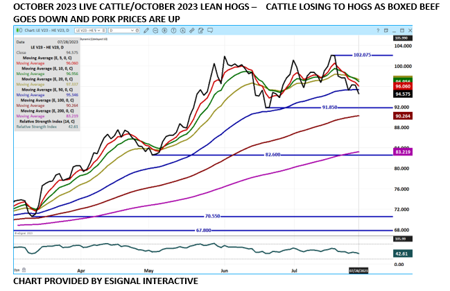 August Lean Hogs settled Friday at $103.20 and the current CME Lean Hog Index is $105.84. For the week as of Friday morning sales the 5 day average carcass was up 78 cents. Loins were steady and bellies were what put the carcass price higher. Butts, Picnics, Ribs and Hams were all lower. There often is a push for bellies for smoking during the summer with the increasing demand for bacon. Unless loins and hams can break through the $100.00 barrier and continue to move up, pork appears to have hit a ceiling.