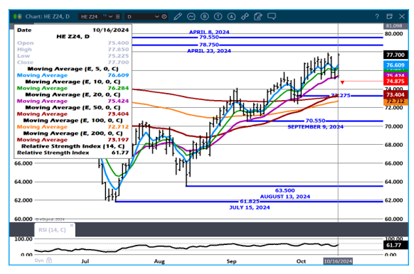 Dec 2024 lean hogs – resistance at 78.75 support at the 20 day moving average at 75.40 (chart below)