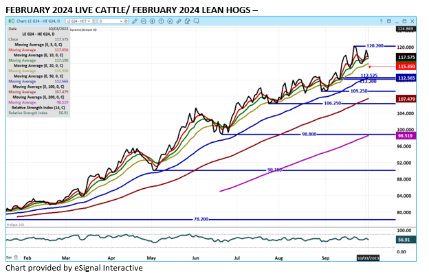 Live Cattle futures was active Tuesday. December Live Cattle closed at $186.65 below the 50 day moving average for the first time since May 5th. Next support is the 100 day moving average at 182.72. Boxed beef was slightly lower early Monday due mostly with Choice primal rib sections falling $15.07 in the morning and $13.41 on afternoon sale.