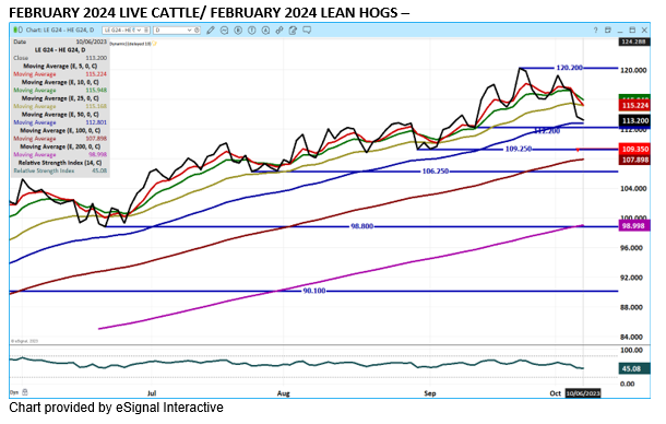 Trade volume was light to moderate Friday with most trading by far on December. October 2023 Lean Hogs closed up for the week as October moved to close the gap between a lower futures to a higher CME Lean Hog Index. The current CME Lean Hog Index is 83.70 and October Lean Hogs settled Friday at 82.32, up $2.12 for the week
