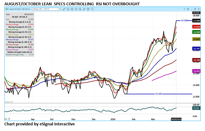 June, July, August, October 2024 and February 2025 Lean Hogs made contract highs Friday. August and October Lean Hogs have made contract highs for the 5th day in a row. April Lean Hogs settled Friday at $89.32 and the CME Lean Hog Index is $85.88 but Index is two days behind. Packers margins remain good. The difference between the Lean Hog Index and the Pork Index has remained above $10.00.