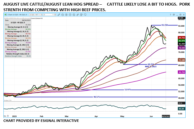 There was a higher boxed beef market and over the coming week beef prices will be a key factor for cattle prices. Packers are going to pass on cattle that aren’t finished to their satisfaction. With very little change on June Live Cattle, up 12 cents from last week, and cash prices dropping from $2.00 to $5.00, the wide difference between the cash and futures is indicating cash prices likely have more downside.