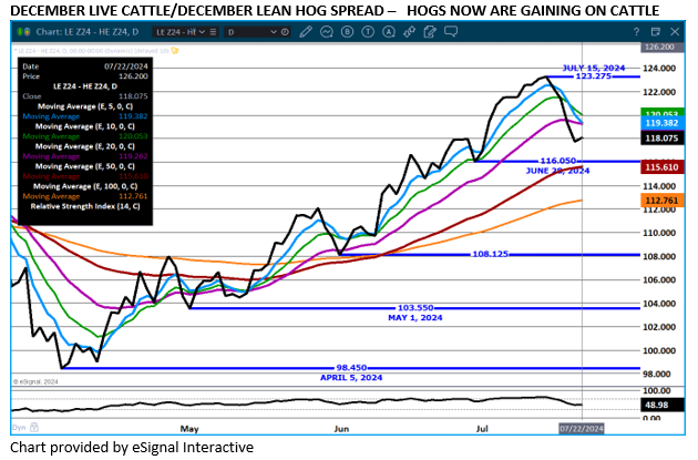 For the day after a cattle on feed report, trade volume was light. October live cattle volume was 18,25 contracts. December volume was just 9622 contracts. Spread trading was the dominate trade. Traders were bear spreading cattle and buying hogs and selling cattle. Currently, the trade is pressuring cattle.