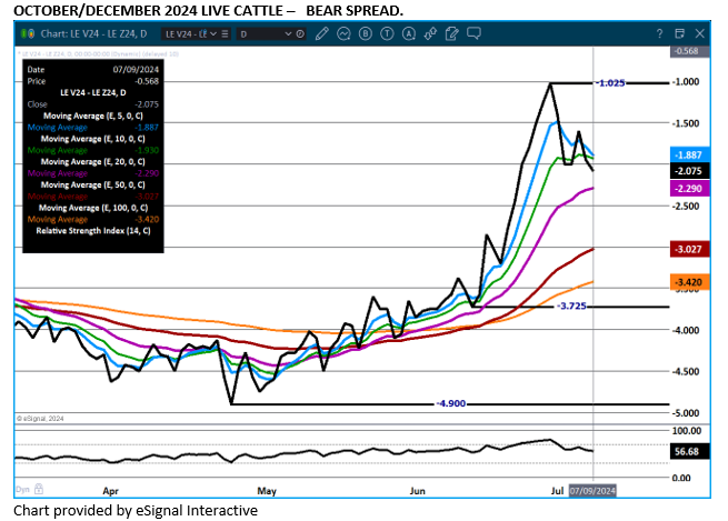 Bear spreading is showing market direction. Trade volume was active Tuesday as futures dropped. There are small traders feeding cattle that have been Texas hedged and yesterday after 2 days of a dropping futures market, they were liquidating as larger spec traders were selling and bear spreading.