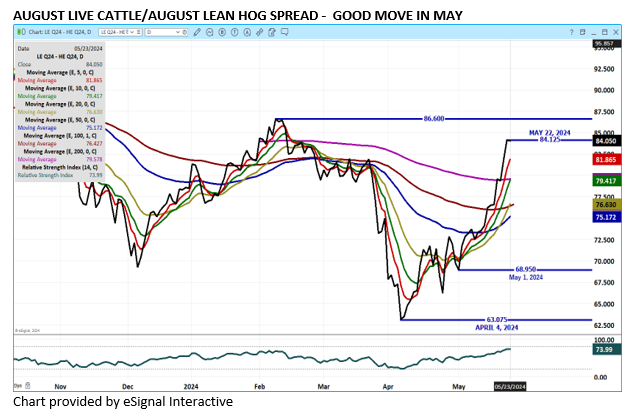 June and August Lean Hogs are bear spread and above the cash market. The difference between the CME Lean Hog Index and the CME Pork Index around $9.00 is positive for packers. If it narrows to $7.50 or less, it is packer negative.